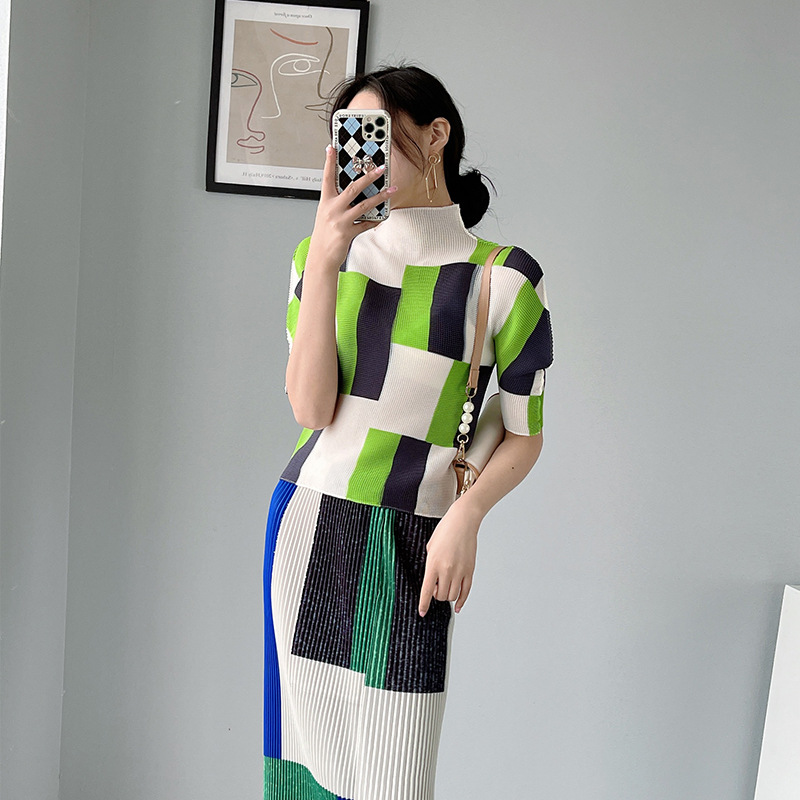 Fluorescent Green Plaid Bottoming Shirt T-Shirt Women's Self-Cultivation High Neck Five Point Sleeve Shirt